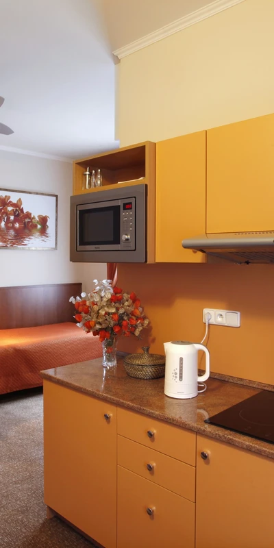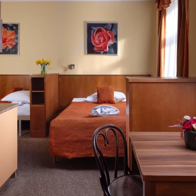 - Skládá se z ložnice s kuchyňským koutem a koupelny s příslušenstvím - Obsahuje 1 manželskou postel a 1 jednolůžko nebo 3 jednolůžkové postele - Maximální počet osob: 3 dospělí a 1 dítě do 2 let v dětské postýlce